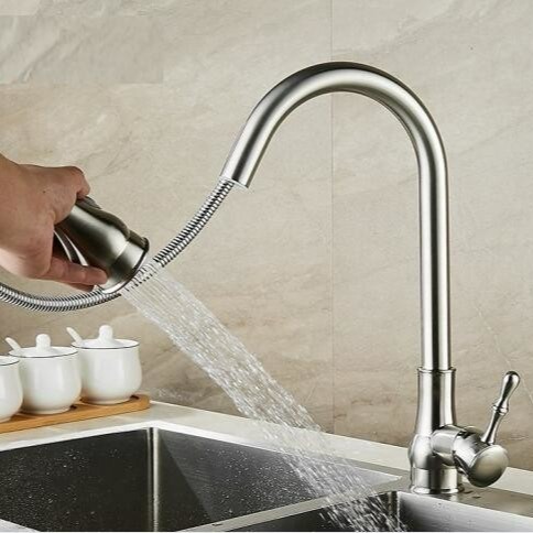 İki Fonksiyonlu Püskürtme Kafalı Pirinç Tek Kulplu Aşağı Çekmeli Püskürtücü Mutfak Bataryası